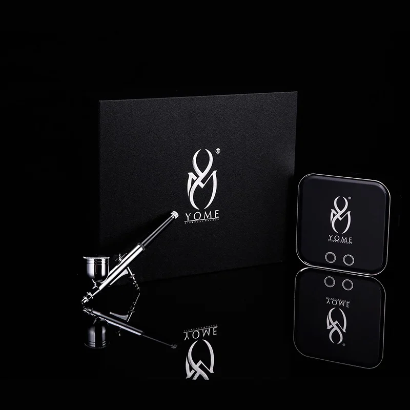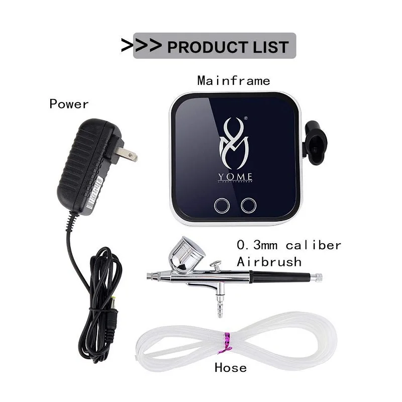 About Yome Airbrush: As the most fashionable technology of making up,airbrush HD makeup utilizes air to spray the make up to face,shoulders and hands,etc.in vaporous form instead of pulling skin,and only needs 1/5 of the traditional make-up time and 1/10 of dosage to put on base makeup,cheek color,eye makeup and contour,etc.It is time and dosage saving,safe and sanitary,etc.,particularly suitable for daily light makeup,marriage makeup and office makeup,etc. Advantages of airbrush HD making-up: Smooth and fine without chromatic aberration or decorous feeling. Mounting steps 1.Connect one end of air hose to the hose coupling of airbrush 2.Connect another end of air hose to the air outlet of compressor 3.Connect AC adapter wire to the port of compressor and connect it with standard power socket. How to use 1.The distance between skin and the front most end of air brush is about 8cm. Don't over spray but shall thinly spray repeatedly. 2.After starting the device,press the left lamp to make oxygen injecting device run. 3.Add makeup base.Please don't add too much,just 5-6 drops are enough for one people.The toner such as hydrolat can be increased or decreased according to personal requirements 4.Poke the trigger of airbrush to squirt the liquid 5.Press right lamp to adjust the running speed of oxygen of injecting device. 6.Press left lamp to turn off the oxygen injecting device. Features Material: Aluminum + Copper + Rubber + Nylon + Plastic Input: 100-250V, 50/60Hz, 0.6A Max Output: 12V, 0.8A Air Output Per Min: 6Lpm ? Max Pressure: 25psi Nozzle Diameter: 0.3mm / 0.011 ? Fluid Cup Capacity: 7cc / 0.43cu in Diameter of Hose: 1/8" ? Hose Length: 1.8m / 5.9ft Air Compressor Size: 11.5 * 11.5 *4.5 cm / 4.5 * 4.5? 2in Airbrush Size: 14.7 * 2.8 * 8.5cm / 5.8 * 1.1 * 3.3in