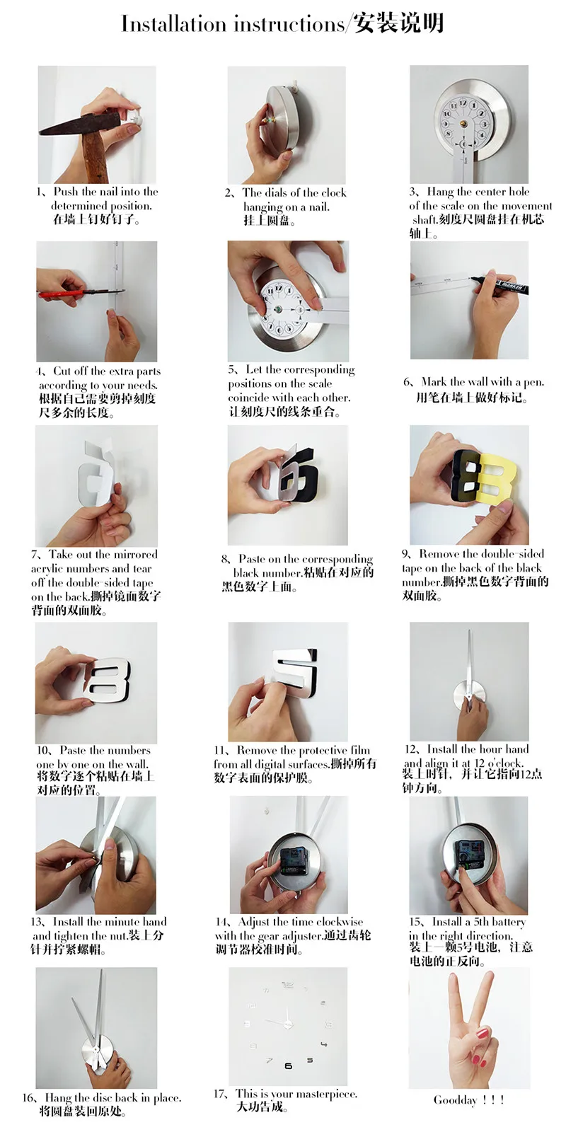 Размер отделки часов Зависит от ваших предпочтений, чтобы украсить вашу стену (70 ~ 120 см)