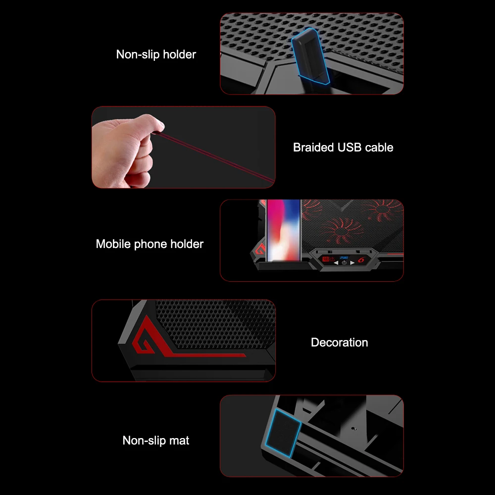Вентилятор охлаждения специально разработан для охлаждения вашего ноутбука и обеспечивает наилучший эффект охлаждения. Дизайн с низким уровнем шума обеспечивает вам очень тихую рабочую среду, что делает его идеальным подарком для вас и ваших друзей. Особенности: Регулируемый ветер Скорость Имеет три уровня регулируемой скорости ветра, и вы можете настроить его по своему желанию. Шесть вентиляторов 6 высокоскоростных вентиляторов обеспечивают превосходное воздушное охлаждение ноутбука с лучшим охлаждающим эффектом. Бесшумный и удобные Бесшумные вентиляторы и двигатель с высокой скоростью, не беспокоить игровой опыт. Эргономичный удобный угол 28 ° Обеспечивает защиту вашего здоровья. Широкий Совместимость Подходит для 17 дюймовых ноутбуков и ниже. Нескользящая производительность Нескользящий держатель и коврик, стабильный и надежный. Удобство Поставляется с держателем на мобильный телефон, для большего удобства. Параметры: Бренд: Coolcold Модель: K38 Размер: 417*300*30 мм/16,4*11,8*1,18 дюймов Размер вентилятора: ≤ 100*100*20 мм/3,9*3,9*0,8 дюймов (3 шт.) Размер вентилятора: ≤ 80*80*15 мм/3,1*3,1*0,6 дюймов (2 шт.) Размер вентилятора: ≤ 70*70*15 мм/2,8*2,8*0,6 дюймов (1 шт.) Скорость вентилятора: 1400-2600 ± 10% об/мин Напряжение: 5VDC В настоящее время; 0,9 ± 10% A Макс. мощность: 4,5 W Вес: 835 г/29,5 унций Посылка включает в себя: 1 * Вентилятор охлаждения