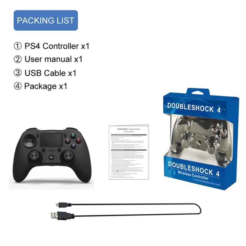 Параметры: Название товара: игровой контроллер Bluetooth для PS4 Совместимость: для PS4/ ANDROID/ PC Функция: поддержка двойного удара, наушников, тачпада, 6-asix,Turbo Идеальная Поддержка игр PS4 Встроенный литиевый аккумулятор, вы можете наслаждаться игрой Материал: АБС-пластик Цвет: черный, красный, белый, синий С 1,5 м usb кабель Две высококачественные аналоговые палочки Содержание упаковки: Геймпад * 1 Кабель USB * 1 Руководство пользователя-1 шт