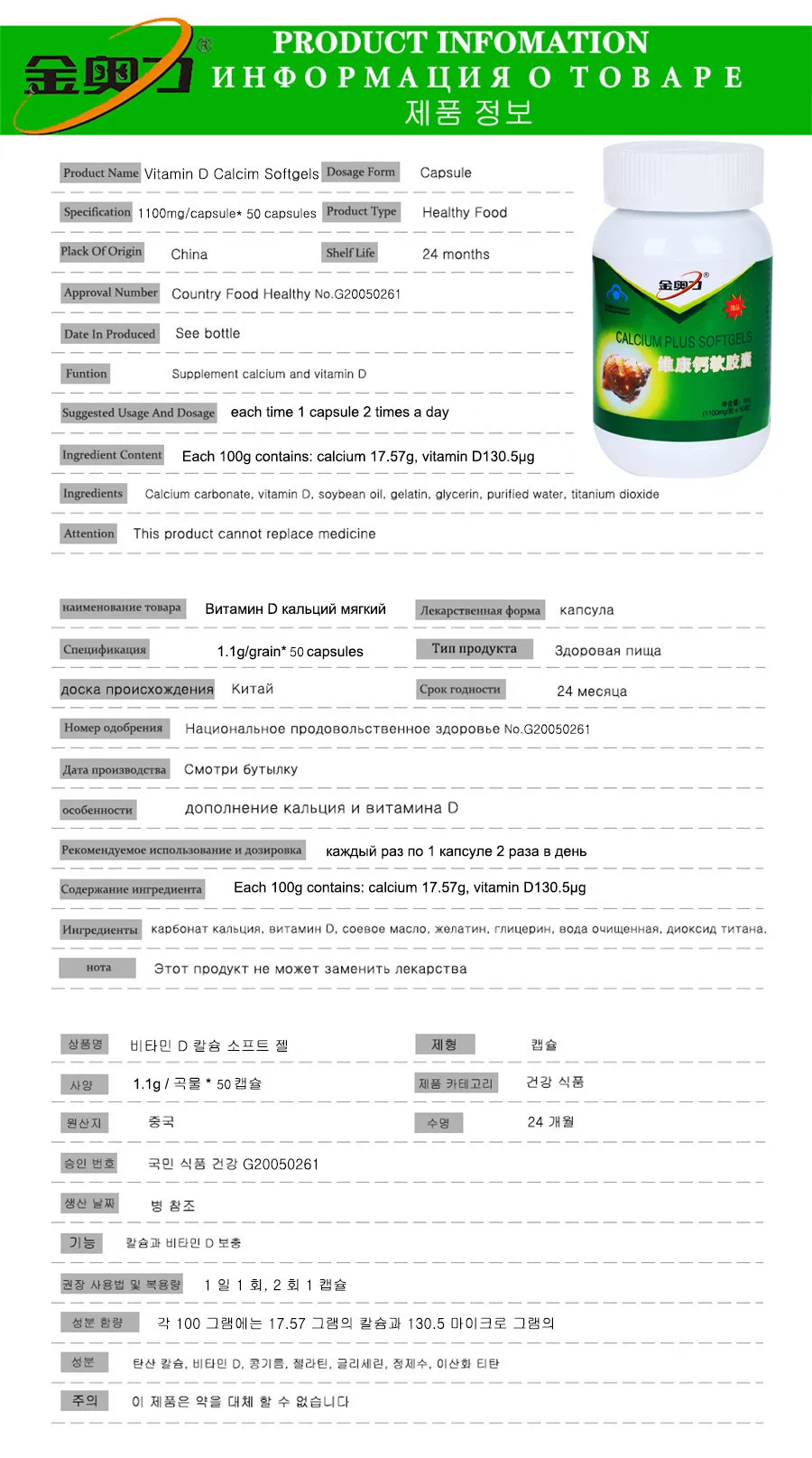 Название продукта: Витамин D кальций софтгель Параметры: 1,1g/капсулы * 50 капсул Происхождение: Китай Номер утверждения: еда в стране, здоровая, № G20050261 День производства: см. Бутылку Функция: добавка кальция и витамина D Использование и дозировка: 1 капсула 2 раза в день, проглатывание теплой водой Состав: каждый 100 граммов содержит: 17,57 граммов кальция и 130,5 микрограмм витамина D Состав: карбонат кальция, витамин D, соевое масло, желатин, глицерин, очищенная вода, диоксид титана Внимание: Этот продукт не заменяет лекарство. Форма дозировки: Капсула Тип продукта: здоровая еда Срок годности: 24 месяца Способ хранения: герметичный, хранить в прохладном и сухом месте