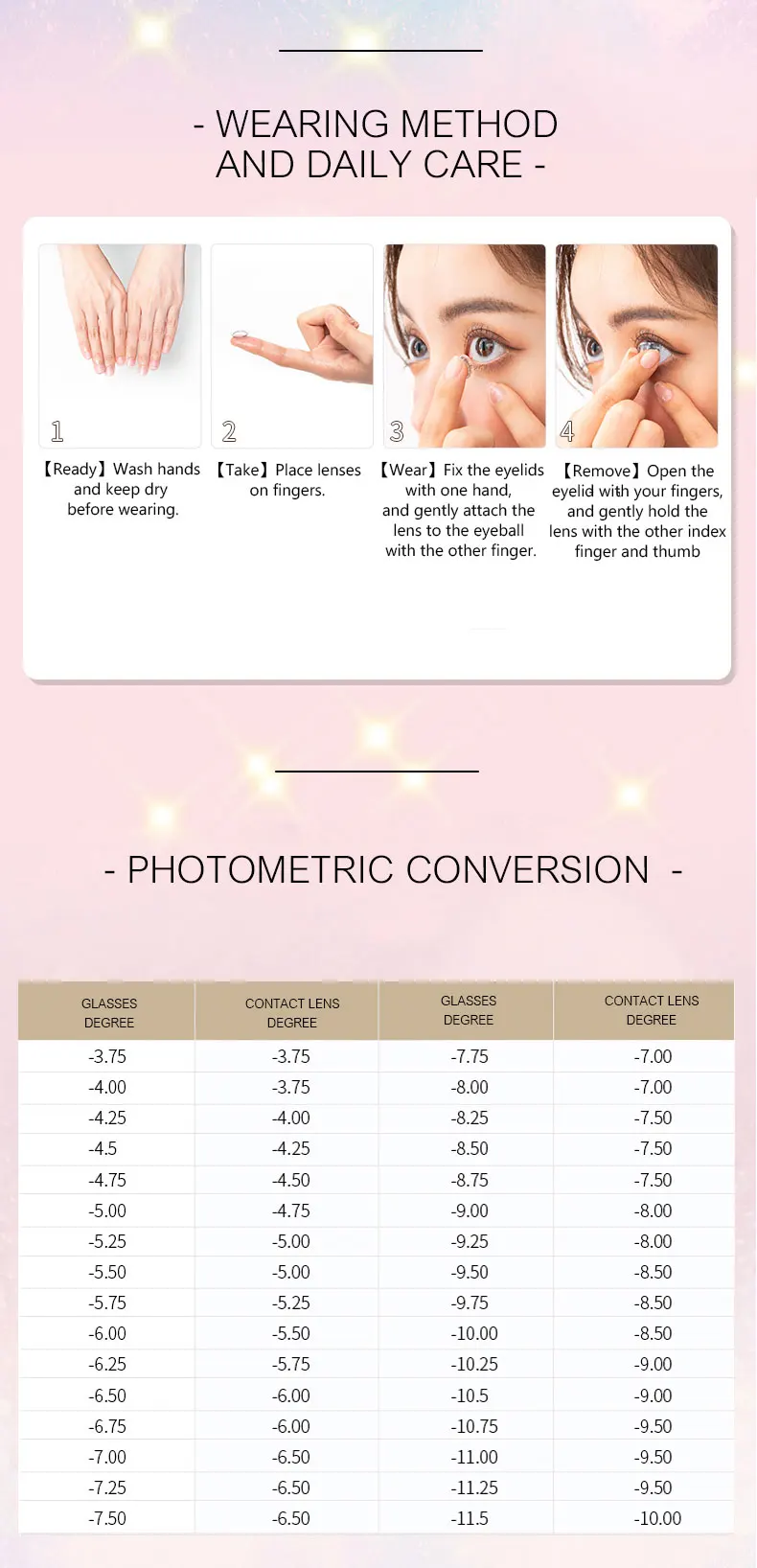 Толщина центра: 0,035 мм Основание кривое: 8,6 мм Диаметр: 14,0 мм Материал линз: хема/силиконовый гидрогель Мощность объектива: 0-800 Посылка: 1 пара (2 шт.) контактных линз