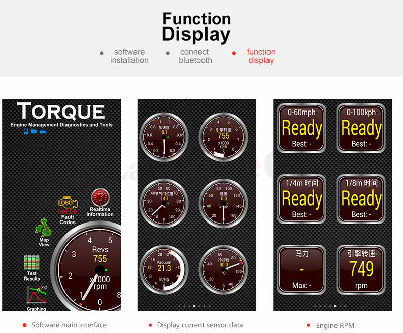 1. Считывание общих кодов неисправностей 2. Очистите коды неисправностей и выключите светильник MIL ("Проверьте двигатель") 3. Отображение данных датчика тока, включая: 4. Двигатель об/мин 5. Расчетное значение нагрузки 6. Температура охлаждающей жидкости 7. Состояние топливной системы 8. Скорость транспортного средства 9. Кратковременная топливная отделка 10. Долгосрочная топливная отделка 11. Давление впускного коллектора 12. Предоплата времени 13. Температура впускного воздуха 14.расход воздуха 15. Абсолютное Положение Дроссельной заслонки 16. Напряжение датчика кислорода/соответствующая кратковременная топливная планка 17. Состояние топливной системы 18. Давление топлива