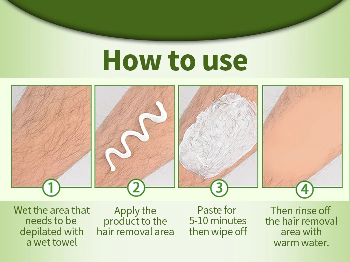 1. Нанесите крем для депиляции на кожу вдоль волоса тела, толщина лучше покрывает тело волос, не трите соскабливающая доска; 2. Пусть крем для депиляции остается в коже 5-10 минут, подождите, пока волосы появятся в обжатом и мягком состоянии, можно использовать скребок, чтобы мягко проверить маленькую кожу, Если волосы на теле легко ломаются, пригодный для использования скребок-это вредный удар, оставшийся крем для депиляции; 3.если Волосы на теле не выпадают, вы можете оставаться на несколько минут, общее время не должно превышать 15 минут; 4. Краску область удаления волос с водой немедленно и применять другие продукты обслуживания после сушки.