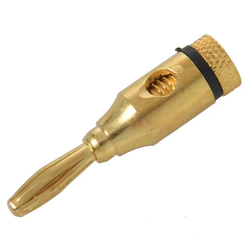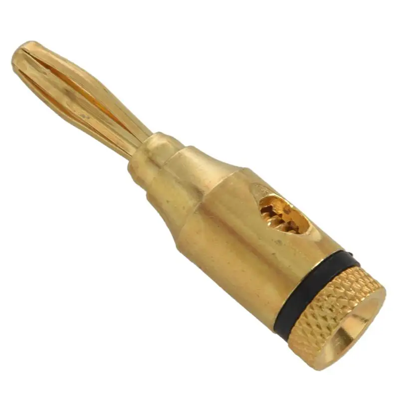 Позолоченные штепсельные вилки типа «банан» 4 мм с винтовым зажимом для простой установки акустического кабеля, кабель может быть подключен с помощью бокового входа, принимает акустический кабель с максимальным диаметром 5 мм.