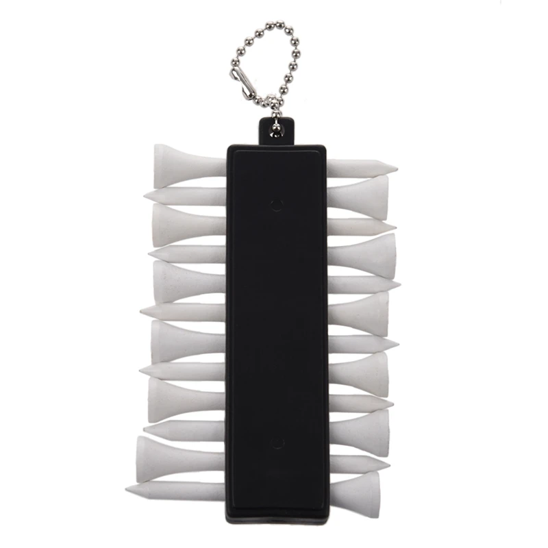 Этот держатель тройника для гольфа содержит 12 белых деревянных тройников для гольфа и три пластиковых шариковых маркера.