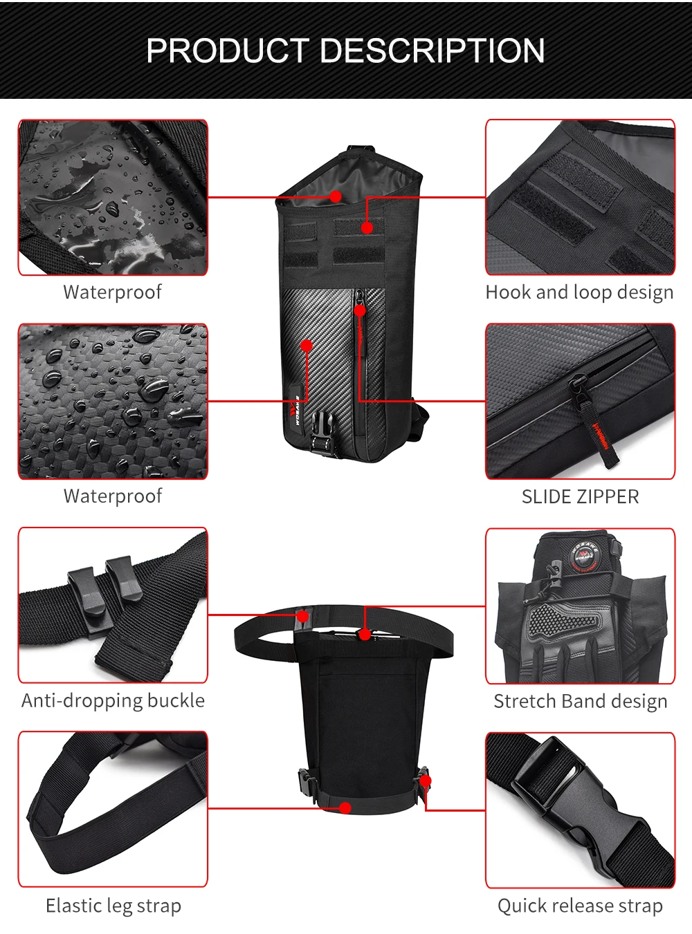 Этот продукт может использоваться в качестве поясной сумки или сумки для ног во время езды на мотоцикле и велосипеде. Идеально подходит для путешествий, работы, школы, спорта, пеших прогулок, охоты, езды на велосипеде, рыбалки, ходьбы, бега и т. д. и ежедневного использования.