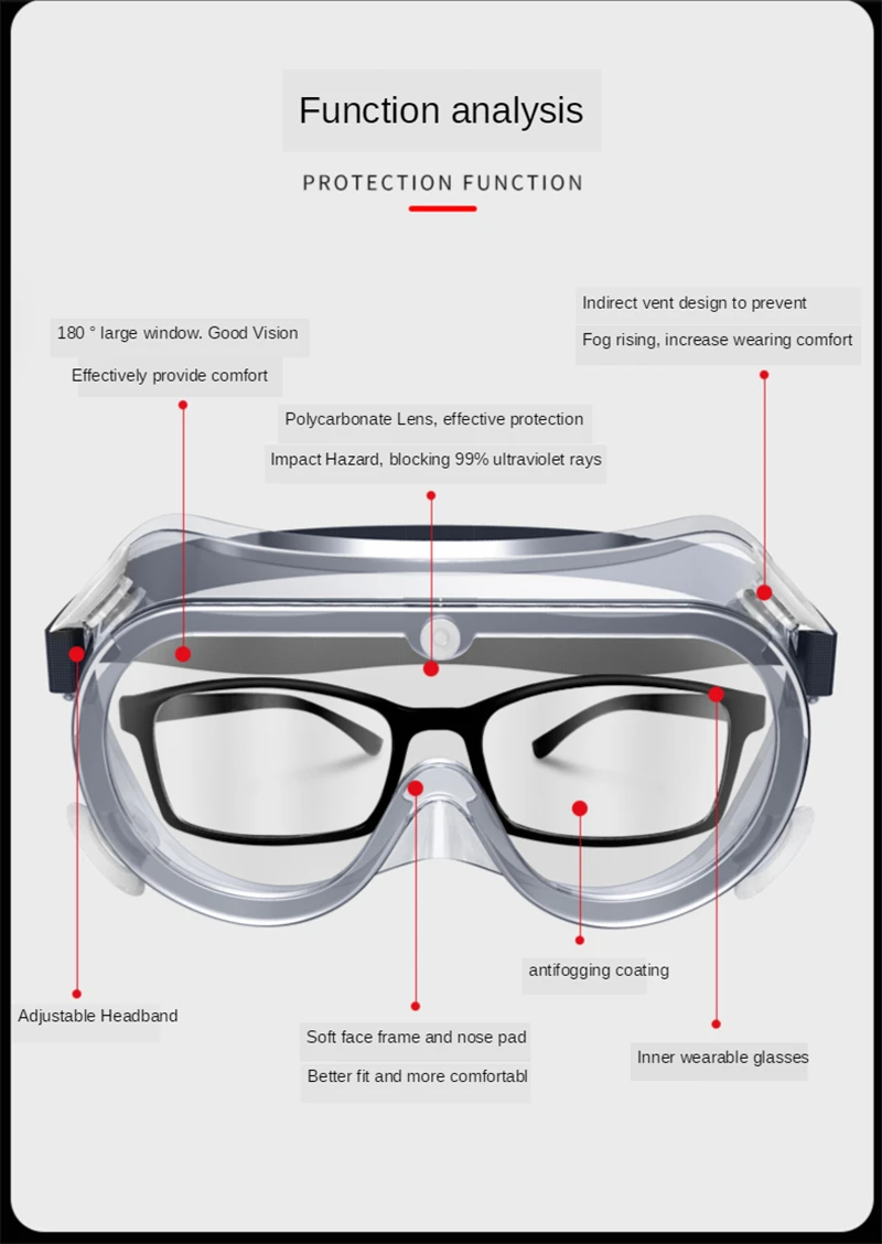1. Большое окно на 180 °. Хорошее видение, эффективно обеспечивает комфорт 2. Непрямой дизайн вентиляционного отверстия для предотвращения, запотевания, увеличения комфорта при ношении 3. Поликарбонатные линзы, эффективная защита от воздействия, блокировка 99% ультрафиолетовых лучей 4. Регулируемая эластичная повязка регулируется в соответствии с индивидуальными потребностями 5. Мягкая оправа лица и носоупоры, лучше сидит и удобнее 6. Антизапотевающее покрытие 7. Профессиональный дизайн, штабелируемые очки для близорукости 8. Мягкая рамка из этилена, мягкая и легко сгибающаяся