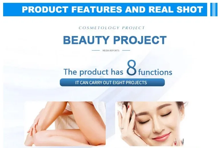 1. Удаление волос: постоянное удаление волос, непристойные волосы (рост волос) по всему телу, включая более светлые волосы. 2. Удаление веснушек: удаление веснушек, хлоазмы, пятен от солнечных ожогов, возрастных пятен, следов от акне, шрамов для лица. 3. Омоложение кожи: улучшает поры, грубую кожу, тонкие морщинки, восстанавливает эластичность кожи. 4. Морщинки: удаляет подлинные, ложные морщины, против старения лица и тела. 5. Лечение телангиэктазии: красная кровь, промывание лица. Удалите темный цвет лица, сделайте кожу белой, однородного цвета. Удалите красные, коричневые, коричневые и другие цветные татуировки. Удалите различные татуировки, брови, губы, татуировки, люверсы и линии губ.