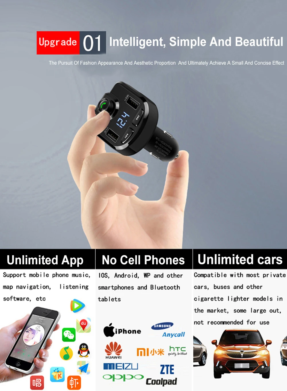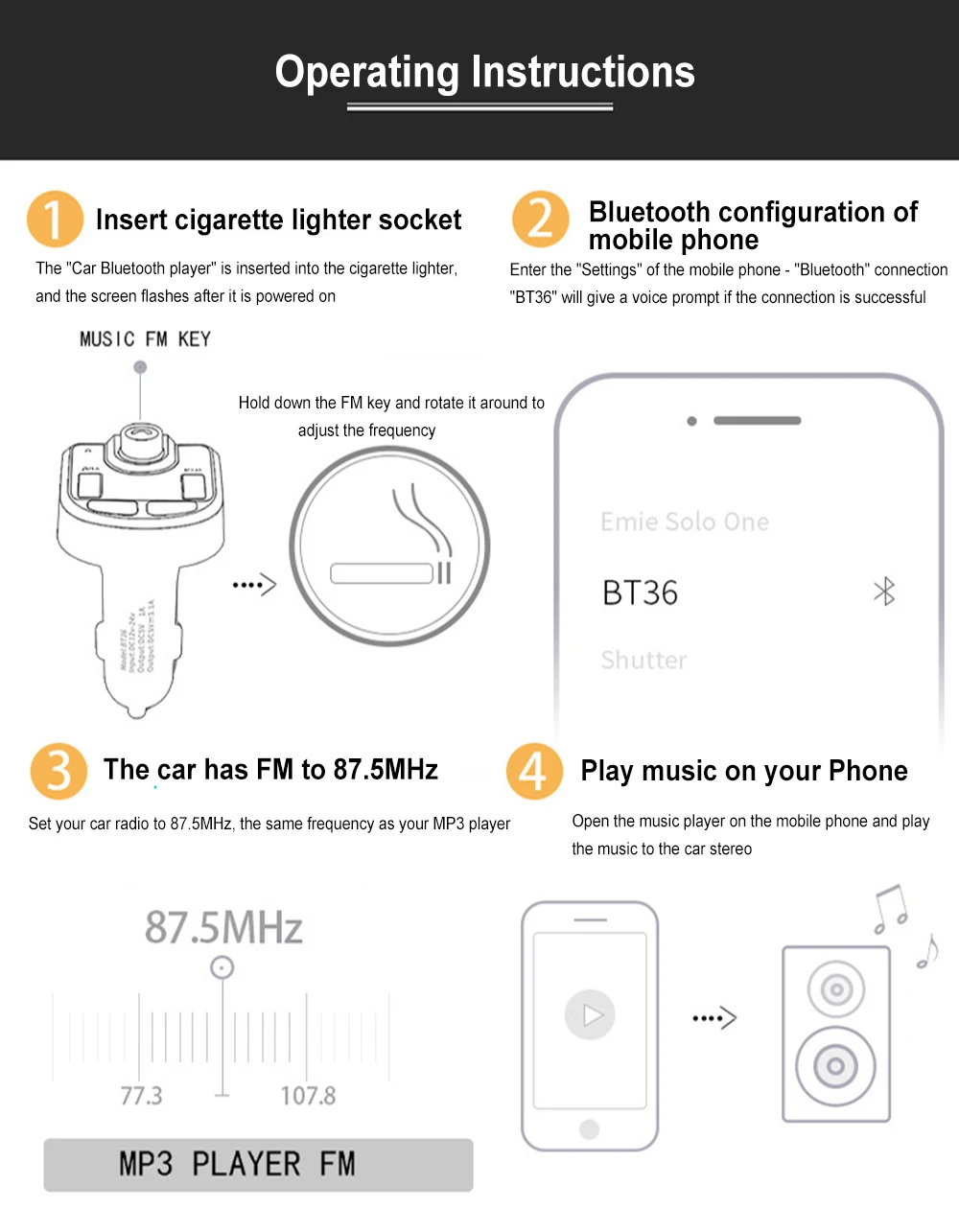 Этот продукт использует полночастотную технологию беспроводной передачи FM и может напрямую считывать аудиофайлы на мобильный телефон с Bluetooth/tf-картой/U-диском. Поддерживает воспроизведение аудио по Bluetooth и звонки по громкой связи по Bluetooth. Поддержка функции интеллектуального приложения, высококачественное декодирование аудио без потерь; Функция usb для зарядки автомобиля В многофункциональном автомобиле MP3. Fast быстрое зарядное устройство USB3.6A, версия Bluetooth 5,0 Поддержка Bluetooth/tf-карты/U диск плеер, Bluetooth громкой связи Покажите частоту экрана, Поддерживаемые функции питания и памяти Поддерживайте зарядку при прослушивании песен Высокоточный структурный дизайн для фортепиано Function Функция шумоподавления, встроенная схема шумоподавления, делает звук вызова более четким Параметры продукта: Интерфейс usb-порта: высокоскоростной USB3.0 Screen экран: светодиодный экран Source Источник питания: мощность прикуривателя Usb ток на выходе: 3.6A Тип карты памяти: tf-карта Поддержка tf-карты/U объем диска: ≤ 32 Гб Power питания: DC12-24V Поддерживаемые форматы файлов: MP3/WMA Номинальный рабочий ток: 50-100mA DC12V Bit скорость передачи данных: 64-320kbps Частотный диапазон: 87,5-108 МГц Передаточное отношение сигнал/шум: 85 дБ (FM: 65 дБ) Коэффициент гармонического искажения: <0.05% FM: <0.1%) Рабочая температура: 0 °C-60 °C Подходящие модели: DC12V -24V универсальные Дальность пуска по воздуху <5 метров Material: АБС-пластик Color: черный Size: 8*5*3,7 см Посылка включает в себя: 1 x Автомобильный MP3-плеер Руководство пользователя-1 шт.