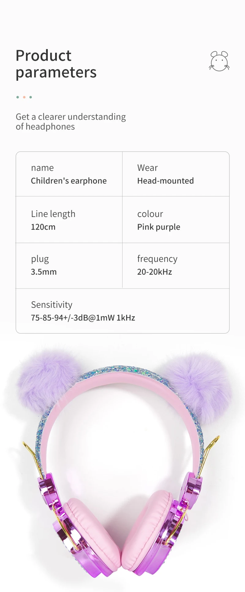 Детские наушники отделаны двумя плюшевыми ушками, наушники инкрустированы стразами