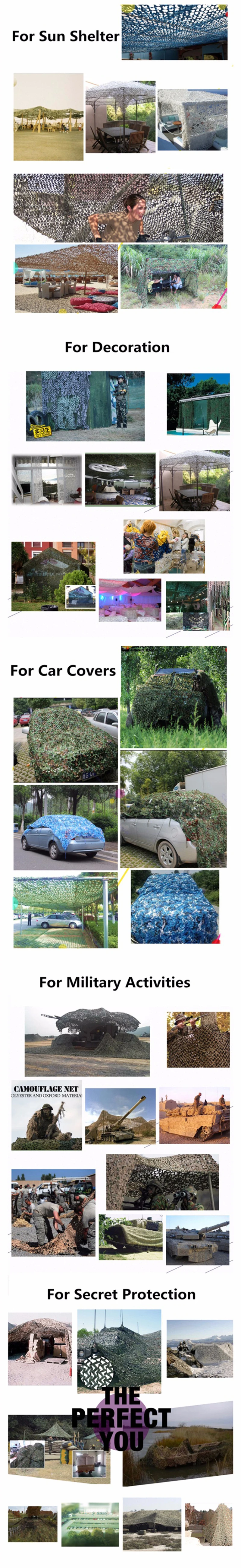 -Камуфляжная армейская подготовка, военные установки анти-Инфракрасный радар. -Незаконные здания и растительная анти-спутниковая фотография. -Автостоянки и другие общественные места для ландшафтного дизайна. -Горные и зеленые покрытия, покрывают мусор. -Для любителей наблюдения за птицами нужно снимать на расстоянии и в контакте с птицами камуфляжной расцветки. -Wargame Снайпер камуфляж и использование. -Декоративное озеленение (тематические парки, выставки, кинобаза, развитие на открытом воздухе, моделирование поля CS, украшение отеля, промышленное украшение, украшение дома и т. д.), цвет фона имитации и другие аспекты.