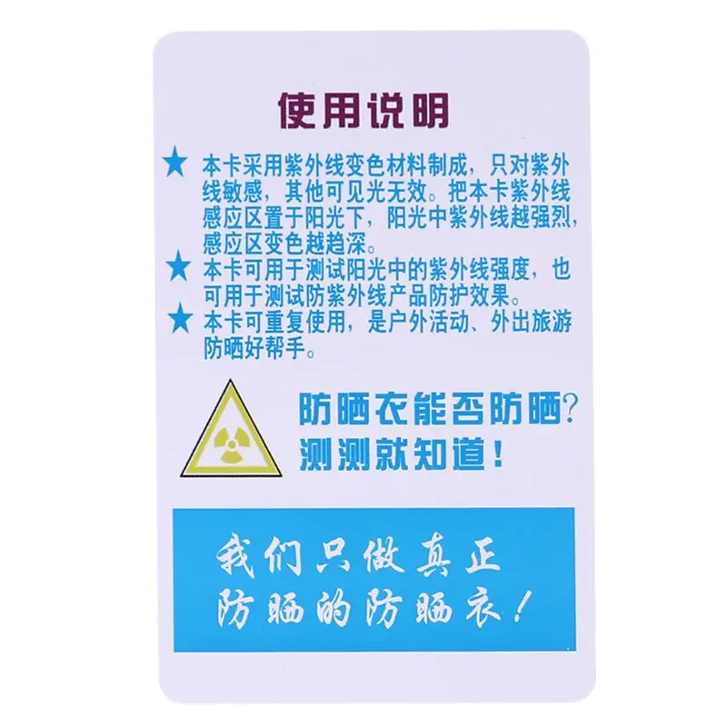 Эта карта изготовлена из ультрафиолетовых материалов, меняющих цвет, которые чувствительны только к ультрафиолетовым лучам, а другой Видимый светильник недействителен. Поместите чувствительную к ультрафиолетовому излучению область карты на солнце, чем сильнее УФ-излучение на солнце, тем темнее цвет.