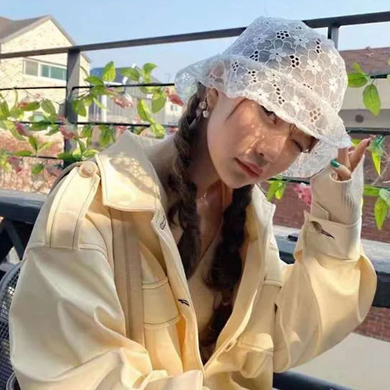 Женская кружевная шляпа в рыбацком стиле, Женская Корейская Повседневная шляпа в виде ковша, летняя тонкая Цветочная полая Солнцезащитная шляпа