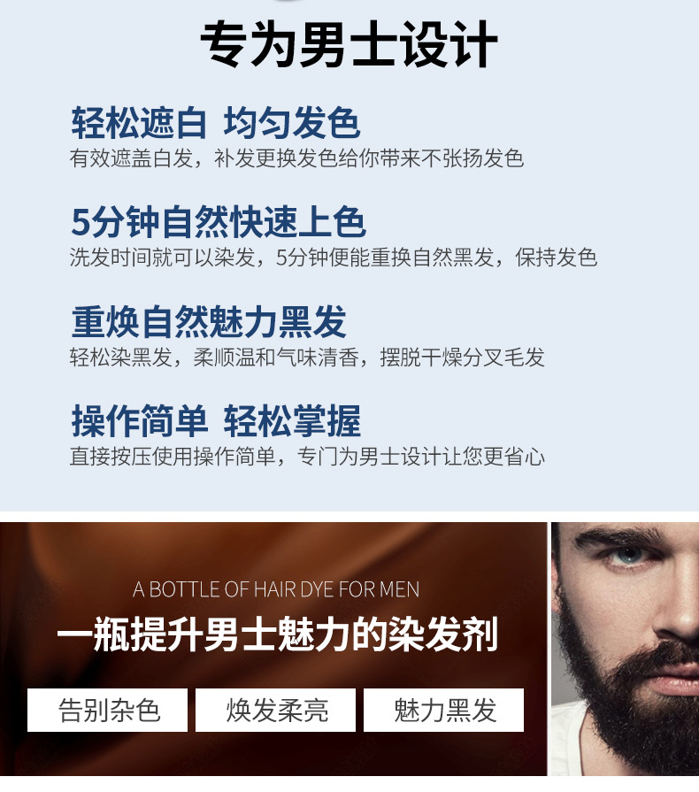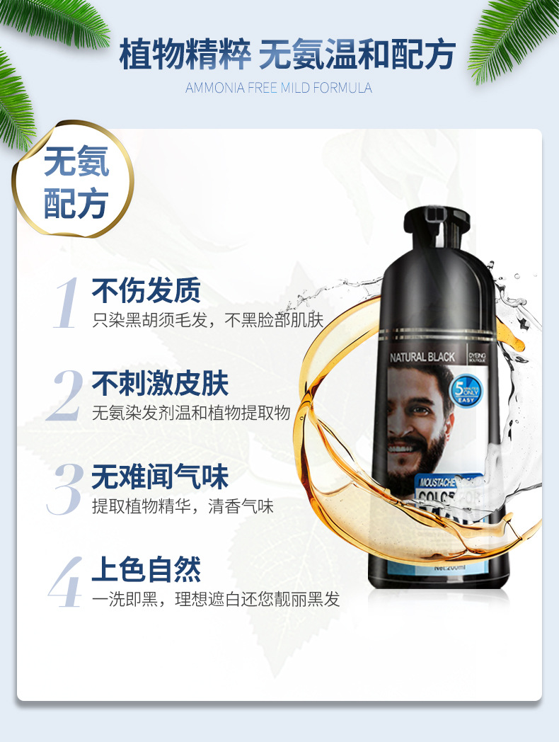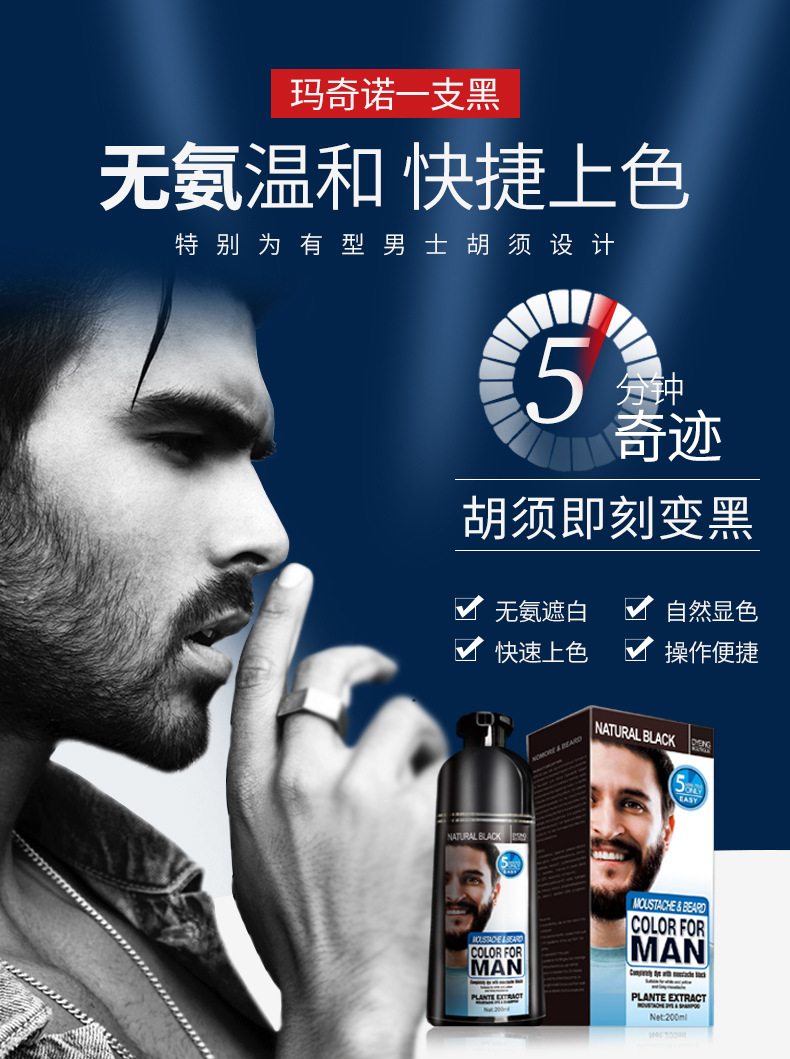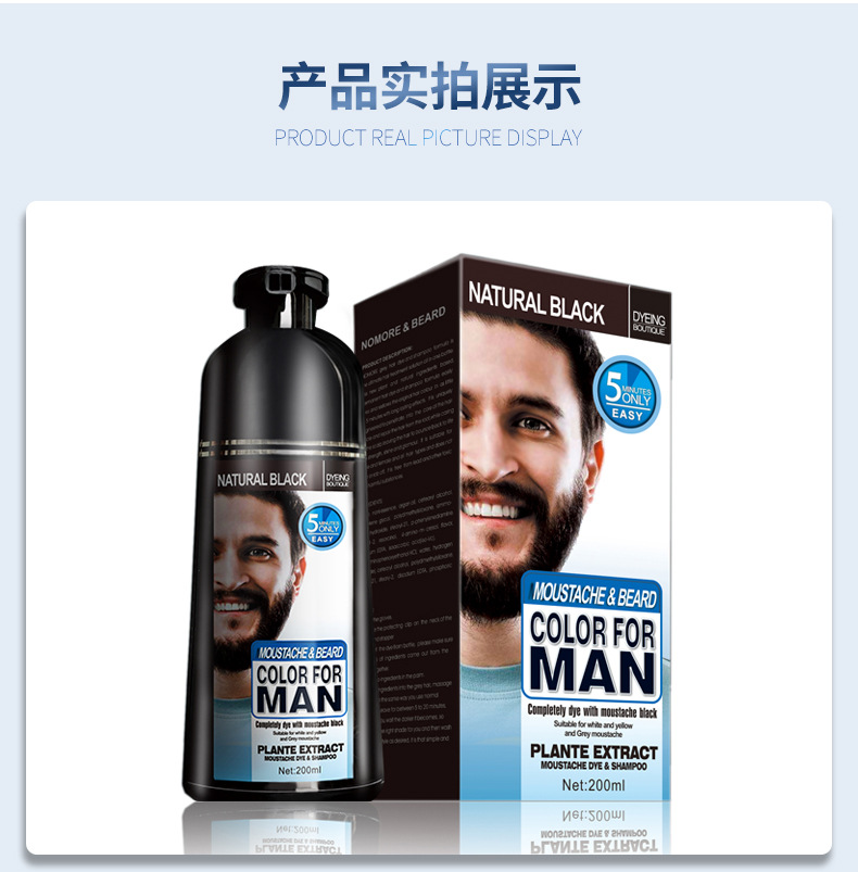 Натуральный стойкий шампунь для удаления бороды и бороды, 200 млВ шампуне beard black Используется уникальная техника окрашивания волос и натуральная формула растительного пигментного коэффициента, чтобы сделать цвет бороды человека более естественным и ближе к истинному цвету бороды. Этот продукт использует новую технологию упаковки, подходящую для ежедневного ухода за бородой мужчин, чтобы сохранить цвет и статус Мужской Бороды в любое время.5 минут краска для черной бородыЕсли вам нужен коричневый или винно-красный цвет, пожалуйста, держите его 20 минутПеред краской бороды, пожалуйста, убедитесь, что борода сухая.Использование:1. Выньте продукты из коробки и наденьте перчатки.2. Вытолкните ингредиенты из бутылки и смешанные ингредиенты в ладони.3. Нанесите продукты на бороду равномерно и помассируйте около пяти минут.4. Примерно через 5-7 минут, затем Вымойте бороду водой для очистки.5. Высушите бороду, затем получите целевой цвет.Обратите внимание:Этот продукт должен использоваться на сухой бороде и не касаться кожи лица. Обычно через 5 минут окрашивается краска, контролируя время нахождения продукта на бороде, может повлиять на глубину цвета.Предупреждение:Храните в недоступном для детей месте. В случае контакта с глазами промойте большим количеством воды.Изображение продукции: