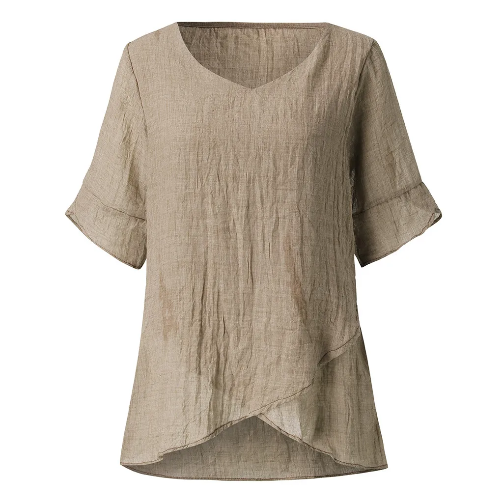 Винтажная блузка с коротким рукавом для женщин, летняя однотонная Асимметричная рубашка с v-образным вырезом, Женская Повседневная свободная туника в стиле ретро, топ, кимоно, блузы