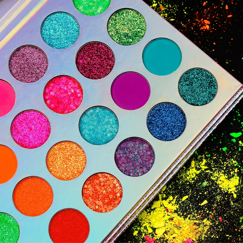 24 цвета, яркие тени для век, включая 5 пентаграмм, мерцающие блестки-светятся в любом месте с УФ-светильник/черный светильник. 5 матовых теней и 6 прессованных блестящих неоновых теней светится в темноте ярко под УФ (ультрафиолетовым) освещением. Цвета красивые и яркие при нормальном освещении, но только светятся, когда есть УФ/черный свет. 8 цветов теней для век в норме.