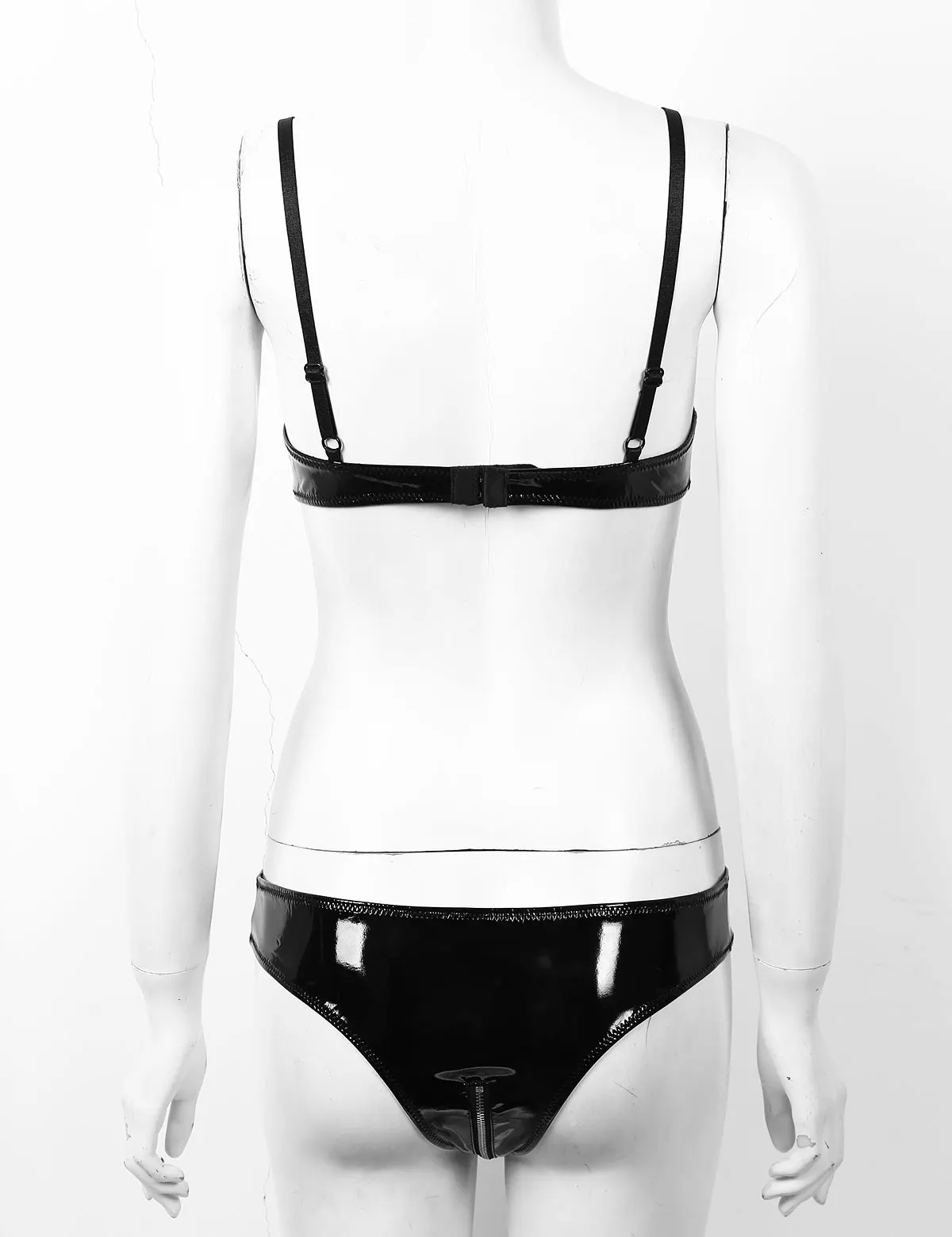 Женский комплект из 2 предметов, женское белье из лакированной кожи, регулируемые бретельки на бретельках, бюстгальтер с отверстиями для сосков, топ с низким подъемом, нижнее белье на молнии, трусики