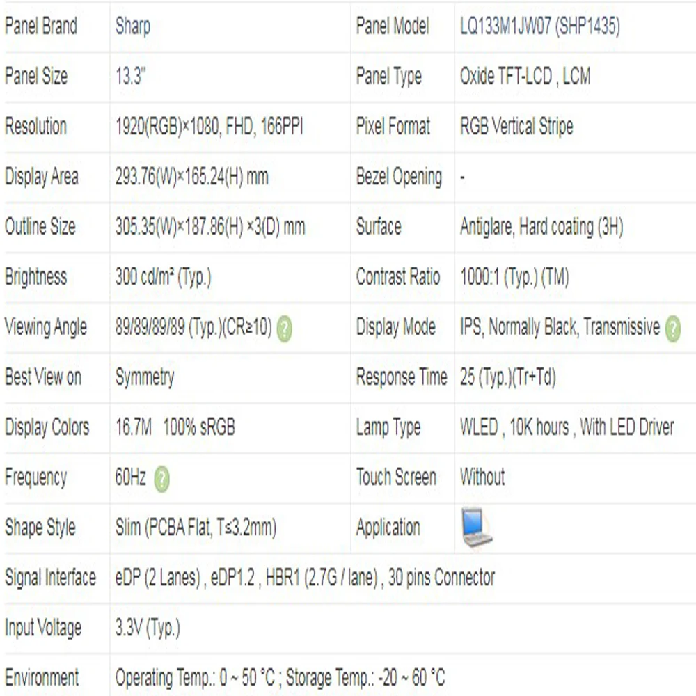 LQ133M1JW07 13,3 "Матрица ноутбука светодиодный ЖК-дисплей Экран для Sharp LQ133M1JW07 1920X1080 FHD eDP30pin RGB Дисплей Панель