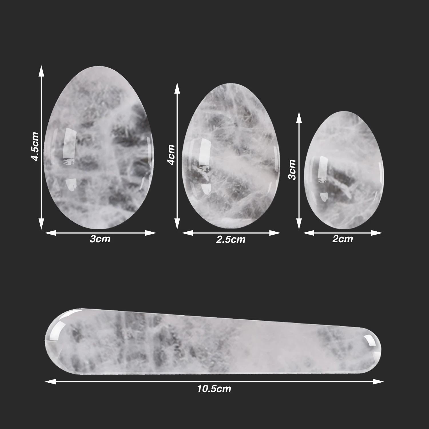 3 размера набор яиц для массажа: L:45*30 мм, M:40*25 мм, S 30*20 мм Подходит для различных упражнений Кегеля. Размер L: для женщин, которые доставили детей в течение определенного периода времени или женщин старше 50 лет Размер M: подходит для большинства женщин Размер S: для женщин, которые практиковались в течение определенного периода и овладели своими вагиановыми мышцами Массажная палочка Размер: около 110*20 мм (Д * Ш)