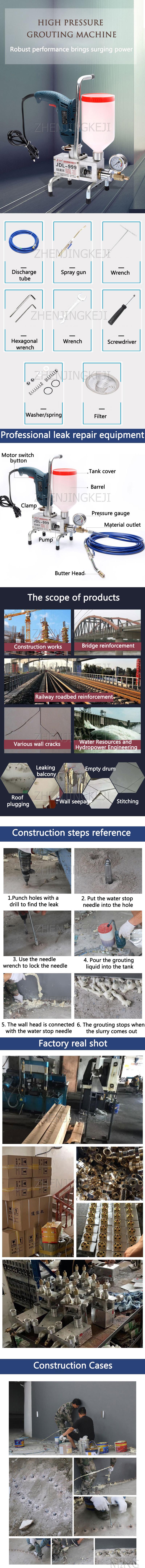 Наименование: машина для затирки Напряжение: 220 В Модель: jdl-999 Мощность: 1100 Вт Вес изделия: 8 кг Размер изделия: 23*34*18 мм Характеристики: водонепроницаемый, высокого давления, высокая мощность 810 Вт затирки машины, полиуретановая цементация оборудования. Область применения продукта: армирование мостов, инженерное армирование железных дорог, различные стеновые трещины, водное сохранение и гидроэнергетические проекты. Этапы строительства: 1. Используйте дрель, чтобы найти утечку 2. Пробить отверстие и положить иглу остановки воды в отверстие 3. Используйте гаечный ключ для иголок, чтобы зафиксировать иглу 4. Включите питание и залейте затирку в резервуар 5. Настенная головка машины соединена с иглой для остановки воды 6. Затирка останавливается, когда шламовый раствор выходит