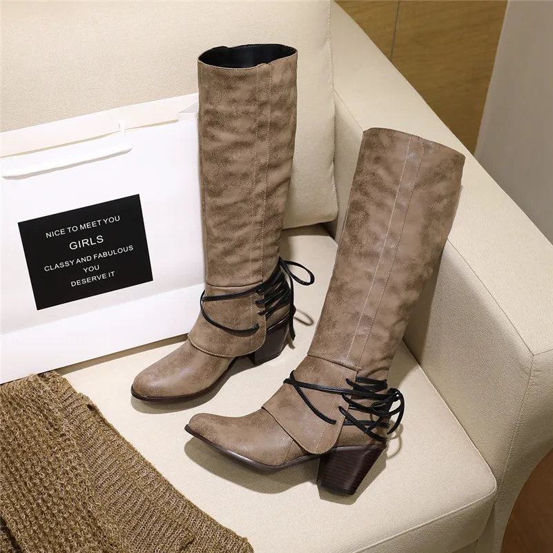 ANNYMOLI/Сапоги до колена женские сапоги на высоком каблуке высокие сапоги на не сужающемся книзу массивном каблуке Женская обувь с перекрестной шнуровкой осенне-зимняя обувь красного цвета, большие размеры 34-43