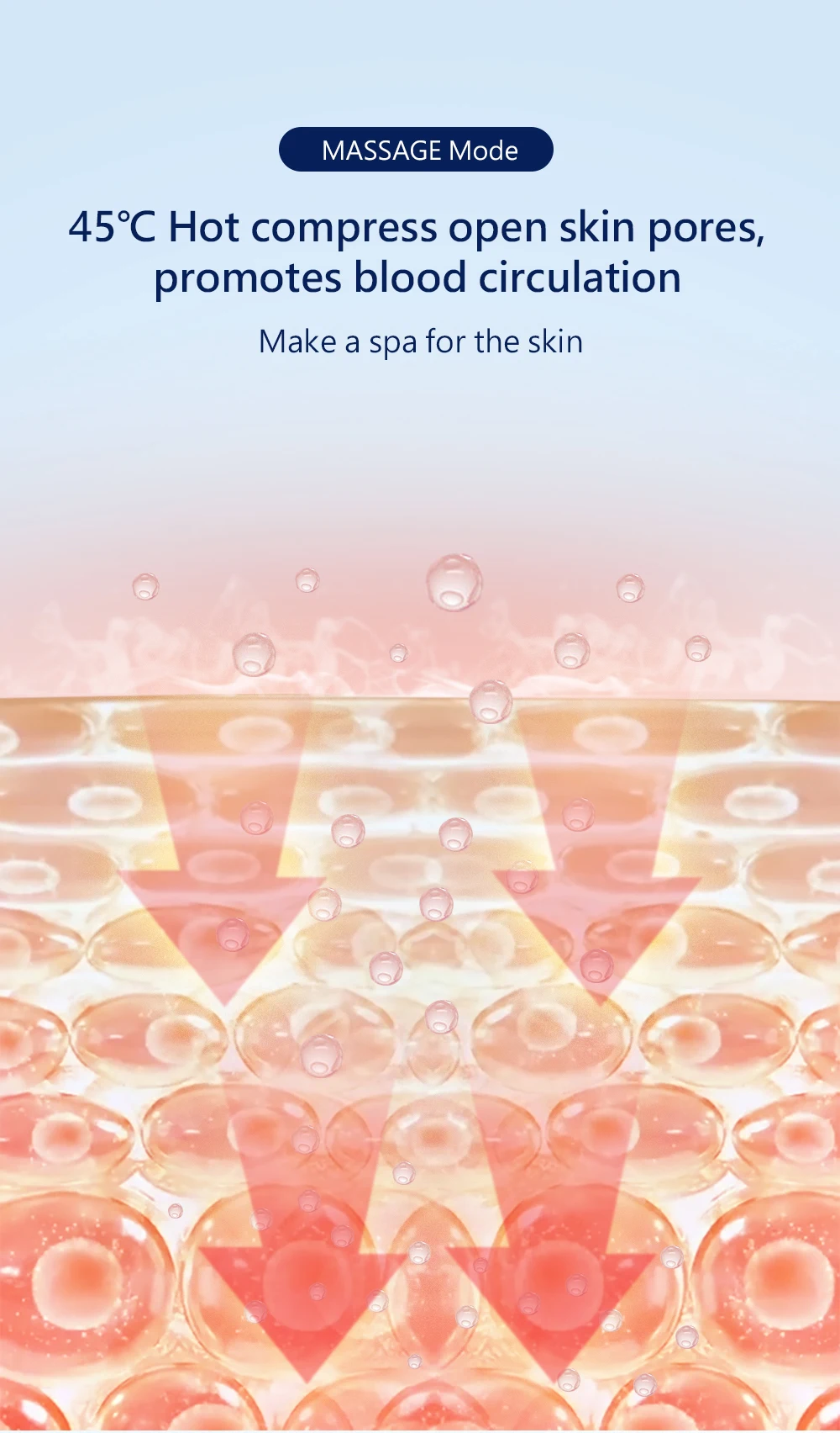 Звуковой режим: особенно для удаления черных точек, высокочастотная звуковая вибрация 24 кГц полностью удаляет черные точки и грязь. --- Режим очистки: глубокое очищение лица, получение положительных ионов, тщательная очистка грязи внутри глубокого уровня кожи. --- Влажный режим: отрицательные ионы способствуют поглощению питательной эссенции для ухода за кожей, делает кожу полной жизненной силы. --- Режим массажа: 45 °C горячий сжатие открытые поры кожи, способствует циркуляции крови, делает спа для кожи. --- Режим подъема: EMS микро-ток стимулирует выработку коллагена, восстанавливает эластичность кожи и делает кожу более гладкой.