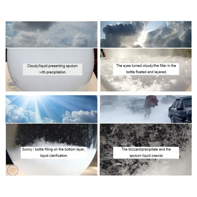 Когда жидкость в бутылке чистая и чистая, от имени погоды; Когда Мутность жидкости в бутылке туманная, от имени облачного неба; Когда бутылка появляется большие кристаллы, представители будут прохладно или даже снег