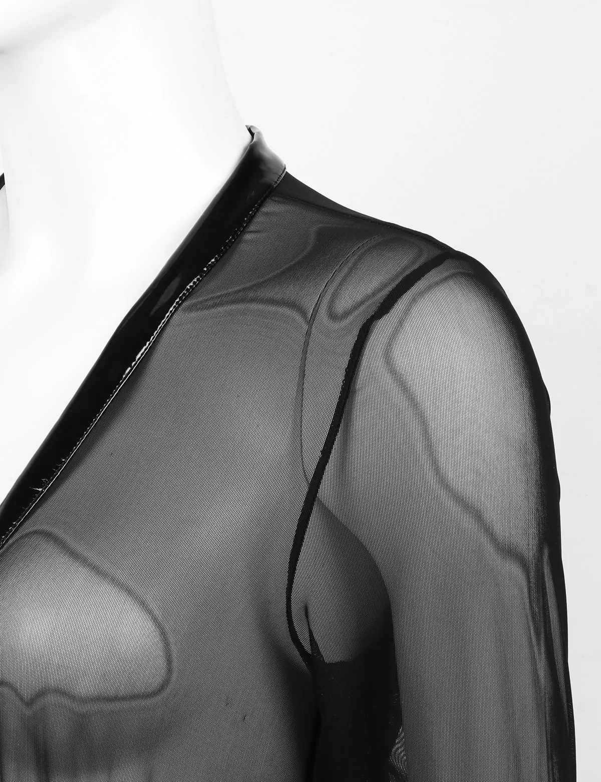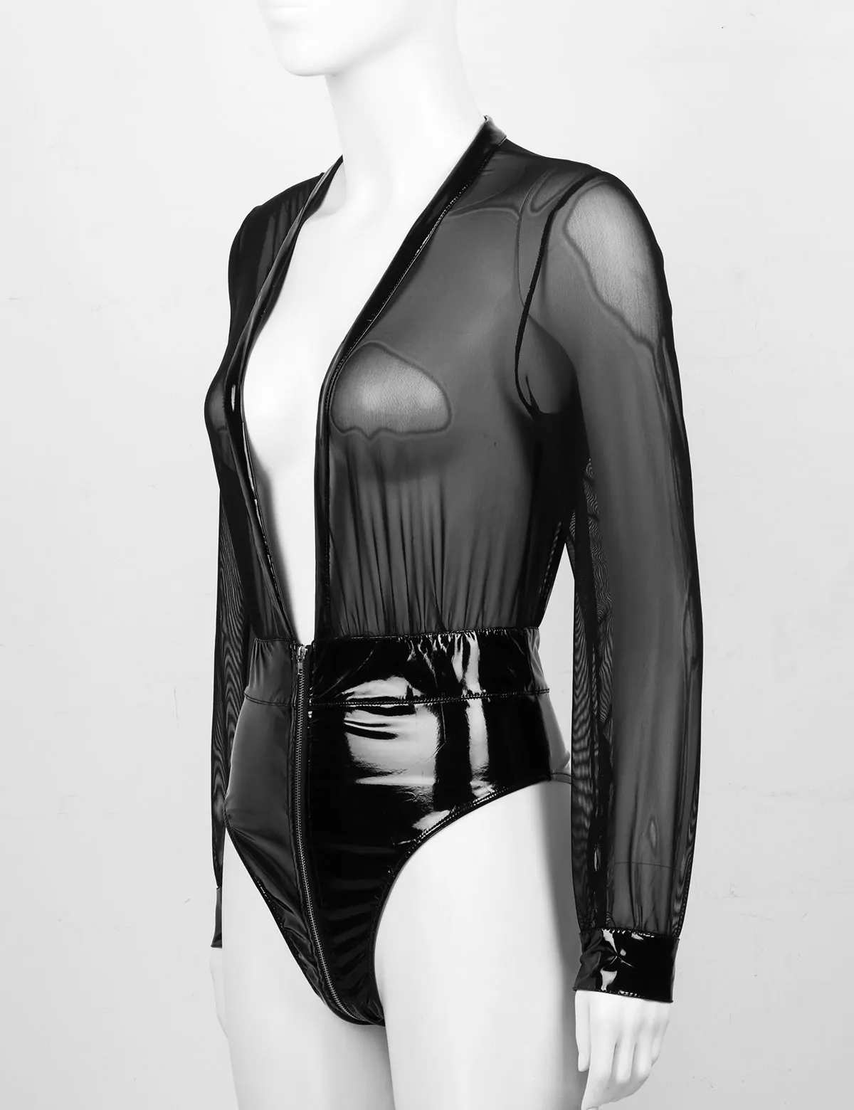 Женский Цельный боди из лакированной кожи с сетчатой вставкой в стиле пэчворк, шикарный и стильный.