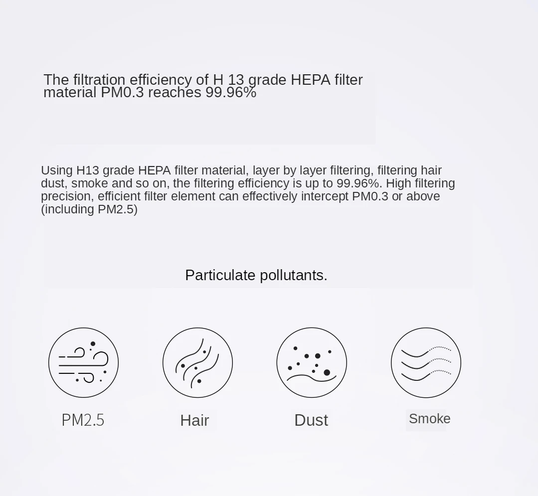 С использованием H13 класса HEPA фильтрующего материала, слой за слоем фильтра, фильтр для волос пыли, дыма и т. Д., эффективность фильтрации достигает 99.97%. Точность фильтрации высокая, и высокоэффективный фильтрующий элемент может эффективно улавливать твердые загрязнители выше PM0.3 (включая PM2.5).