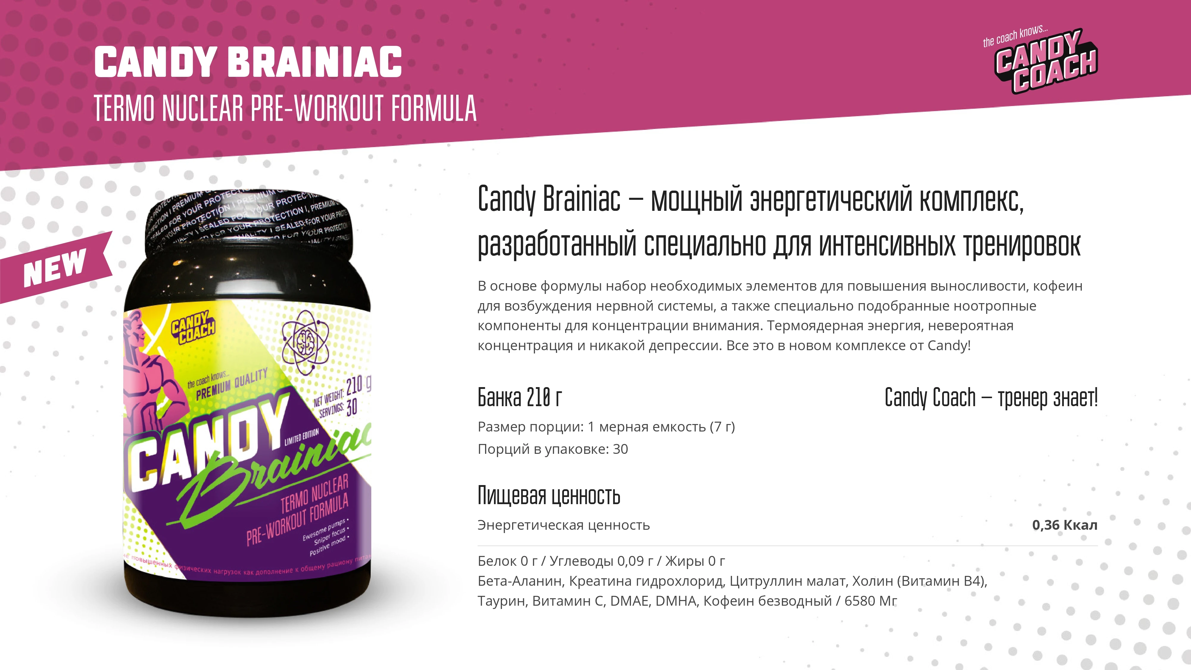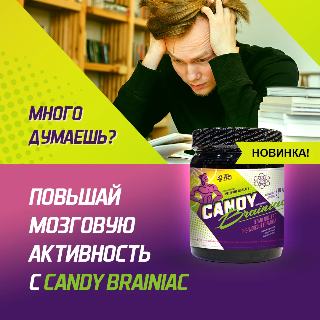 Candy Brainiac – мощный энергетический комплекс, разработанный специально для интенсивных тренировок. В основе формулы набор необходимых элементов для повышения выносливости, кофеин для возбуждения нервной системы, а так же специально подобранные ноотропные компоненты для концентрации внимания. Термоядерная энергия, невероятная концентрация и никакой депрессии. Все это в новом комплексе от Candy! Candy Coach- тренер знает!