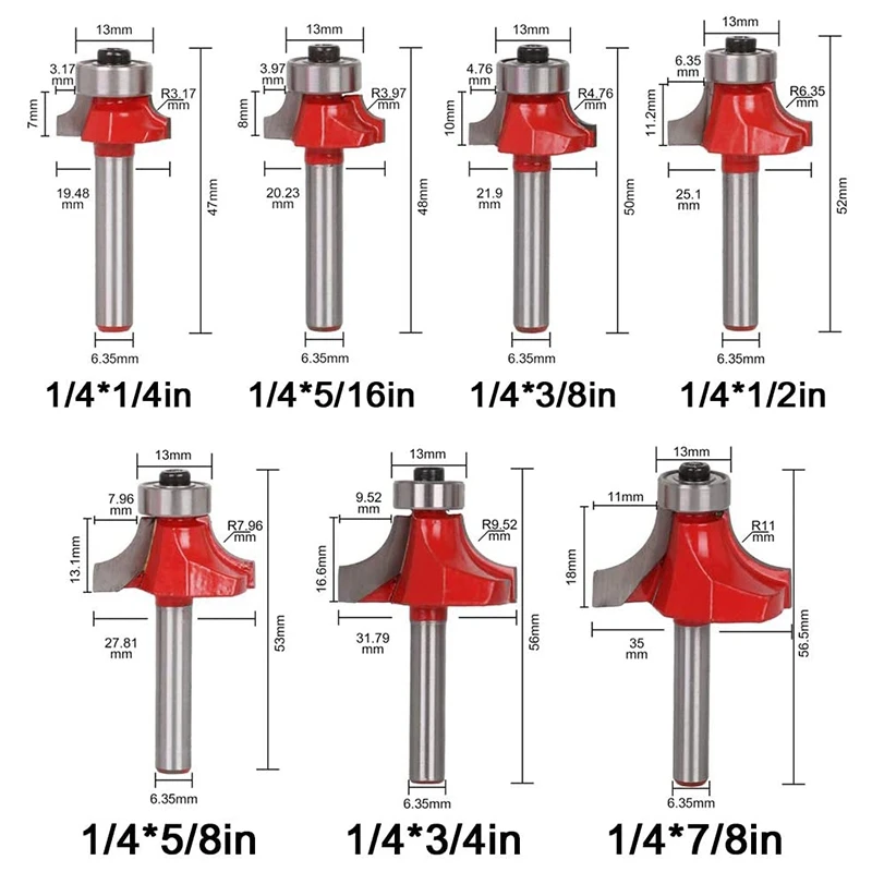 7 шт. 1/4 дюйма хвостовик Круглый За фрезы угловой Закругление кромки-формовка набор инструментов для деревообработки фрезы