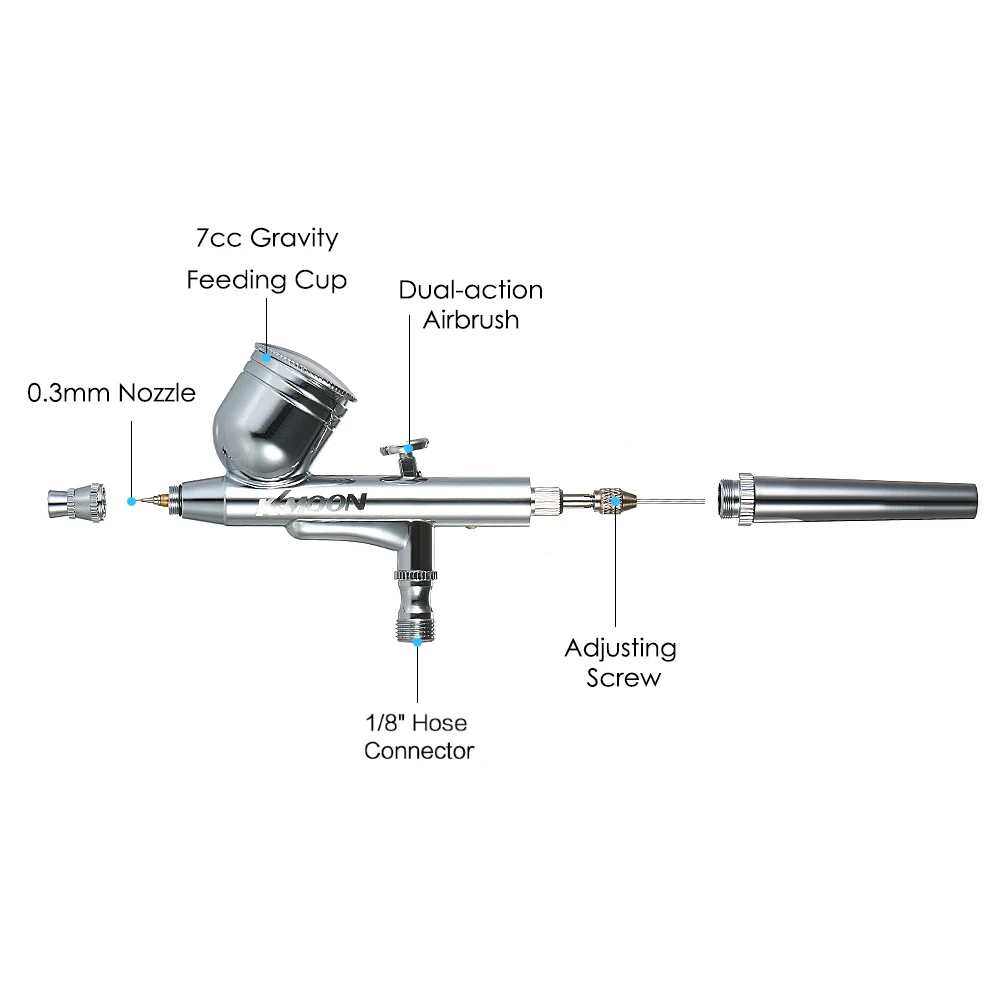 Включает портативный воздушный компрессор, воздушный шланг, двойного действия гравитационный питательный Аэрограф, мини воздушный фильтр и держатель.