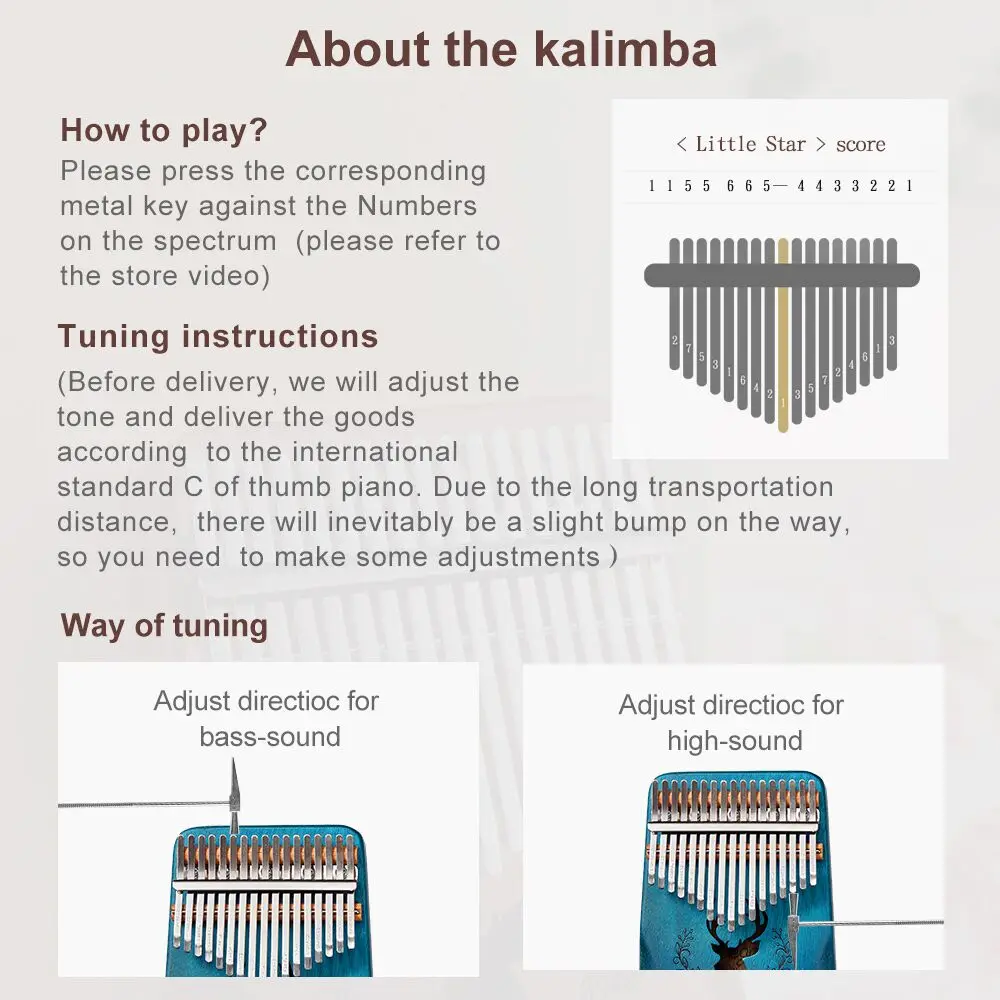 Как играть? Пожалуйста, нажмите соответствующую металлическую клавишу против чисел в спектре (пожалуйста, обратитесь к видео магазина) Токарная обработка инструкции (Перед поставкой, мы отрегулируем тон и поставляем товары в соответствии с международным стандартом C большого пальца пианино. Из-за большого расстояния перевозки, неизбежно будет небольшой удар по пути, поэтому вам нужно внести некоторые корректировки) Способ настройки Как показано на рисунке ниже, значок слева для регулировки басов, значок справа-для регулировки высоких частот